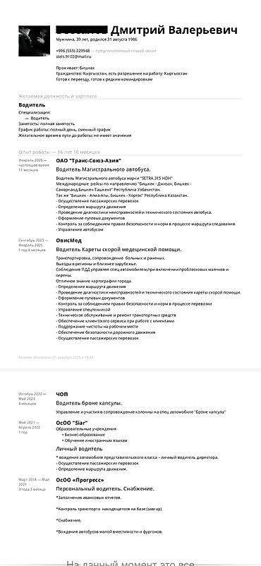 Ищу постоянную работу. Все категории есть, работал водителем автобуса более 10 лет. Кант Новопокровка Лебединовка жактан жумуш издейм водитель