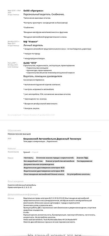 Ищу работу личный водителя Стаж больше 20 год, проживание город Бишкек умею ремонтировать машину , город хорошо знаю, и правила дорожного движения, безопасности пассажиров. автомобиль. легко...