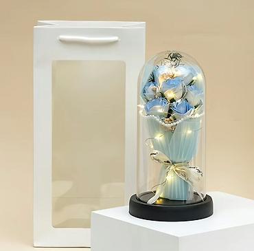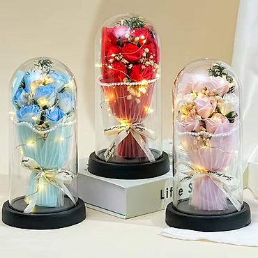 розы в колбе - Светильник «Роза в стеклянной колбе»: объемная декоративная роза с переливчатым покрытием на золотистом стебле, внутри — тонкая LED-нить с множеством огоньков. Прозрачный колпак-куп...