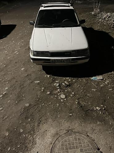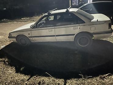 Mazda 626, седан, белый цвет. Кузов с чёрными декоративными молдингами, установлен багажник на крыше. Передняя оптика прямоугольная, бампера в цвет кузова с чёрными вставками. Сзади — фирменные шильдики Mazda 626, спойлер на крышке багажника, антенна на крыле.