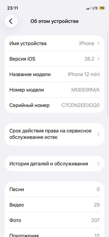 IPhone 12 mini, 128 ГБ, цвет синий Характеристики и детали с экрана устройства: - Модель: iPhone 12 mini (номер модели MGE63B/A) - iOS: 26.1 - Память: 128 ГБ, доступно около 81,17 ГБ - Серийный но...