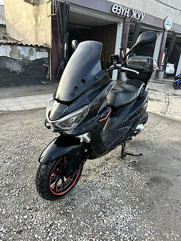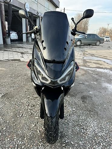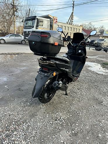 Скутер/максискутер черного цвета с высоким ветровым стеклом. Современная агрессивная оптика спереди, светодиодные фары и поворотники. Установлены: - высокий лобовой обтекатель для улучшенной защиты...