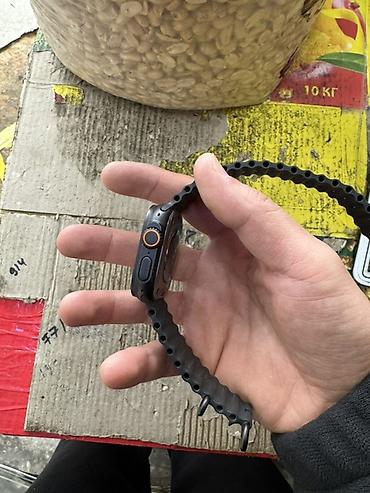 Смарт-часы в корпусе прямоугольной формы с крупным дисплеем и боковой колесой/кнопкой управления. Цвет корпуса — темно‑серый/черный, ремешок — черный, рифленый, с регулировкой по длине и классической петлёй для застегивания.