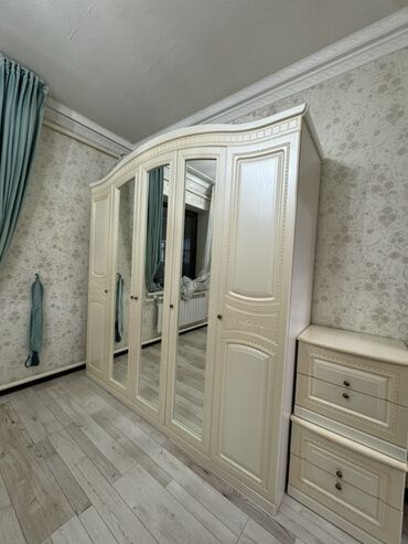- Шкаф пятидверный: три центральные створки с зеркалами, боковые глухие. Верх с фигурным карнизом. Ручки‑пуговки в едином стиле.