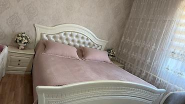 - Двуспальная кровать с высоким изголовьем: изголовье мягкое, капитоне с пуговицами, каркас с фигурным царговым оформлением. В комплекте покрывало и две подушки в пудрово‑розовом цвете.