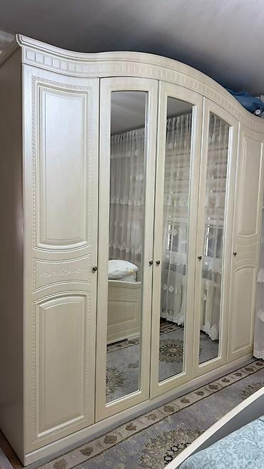 - Шкаф 6‑дверный: центральные створки с полноразмерными зеркалами, глухие панели по бокам, фигурный волнистый карниз, металлические круглые ручки. Внутри — секции под одежду (полки/штанги).