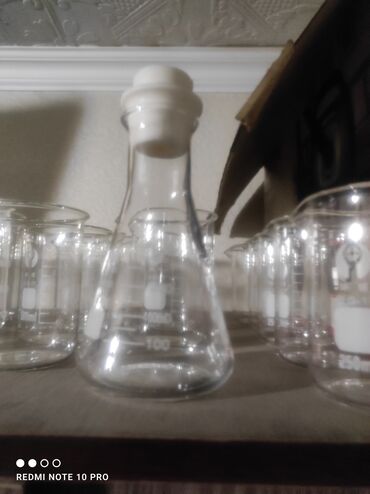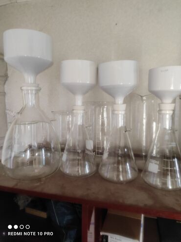 так же имеется различная лабораторная посуда, много мерных колб, воронки Шотта, воронки Бюхнера,стеклянные воронки, колбы Бунзена, фильтры бумажные, колбы с крышками 250 мл