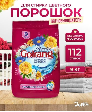 - Golrang Color 9 кг — для цветного белья, с пятновыводителем, до 112 стирок, без хлора и фосфатов.