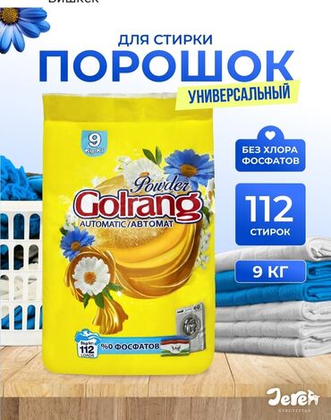 - Golrang Universal 9 кг — универсальный, до 112 стирок, 0% фосфатов.