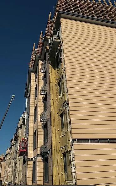 - Современные 6‑этажные дома с лифтами, фасад вентилируемый, декоративные панели и темные оконные профили.
