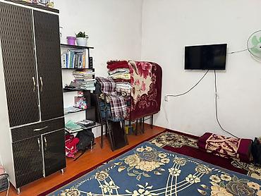 - Просторная комната, совмещенная с обеденной зоной; большое окно с тюлевыми шторами, настенный телевизор, вентилятор, шкаф-купе/двухстворчатый шкаф, стеллаж, обеденный стол со стульями, ковровое покрытие.