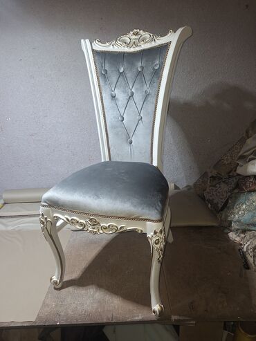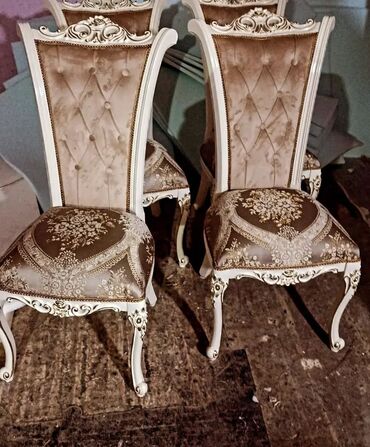Классические обеденные стулья в стиле барокко/рококо. - Материал: пластиковый каркас с декоративными золочёными элементами. - Спинка: мягкая, с капитона (пуговицы), резной верх с завитками. - Сиде...