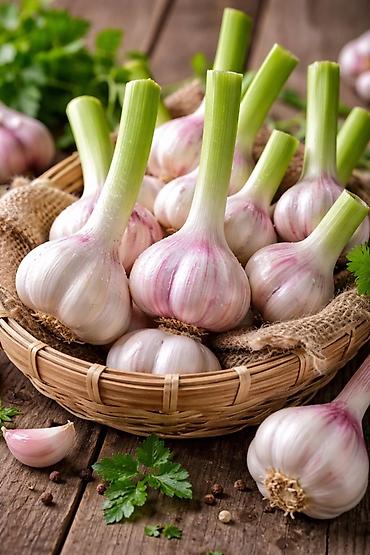 - Ароматный молодой чеснок с сочными зелёными стеблями и розоватым оттенком чешуек.