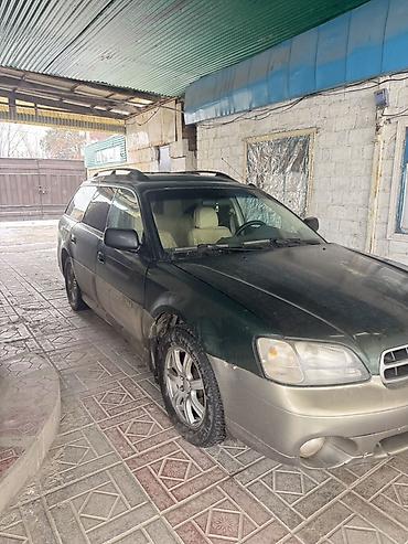 Автомобиль Subaru Outback 2001 в кузове универсал, окрашенный в темно-зеленый цвет с бежевыми элементами отделки. Оснащен рейлингами на крыше и люком. На машине установлены легкосплавные диски и зимние шины. Имеет полный привод (AWD) и противотуманные фары на переднем бампере. На задней части автомобиля присутствует спойлер, а на крыше — антенна. Салон светлый, виден через окна. Модель Legacy Outback, как указано на задней части кузова. Автомобиль имеет государственные регистрационные знаки Кыргызстана.