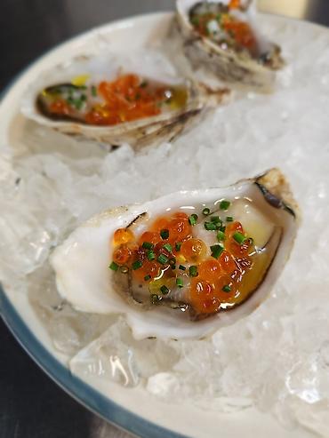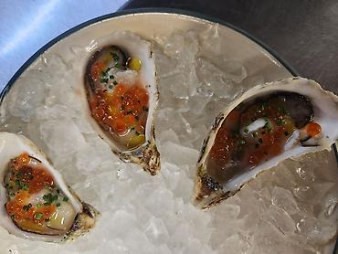 - Холодные устрицы на льду, украшенные лососевой икрой, мелконарезанным зеленым луком и каплями оливкового масла. Подача — на блюде со льдом, по 3 штуки.