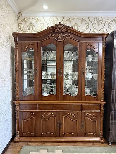 крупногабаритный. - Материал: натуральное дерево тёмного оттенка (похоже на махагон/орех), фасады с резными элементами и фигурным карнизом. - Конфигурация: четыре секции по ширине. - Центральный...