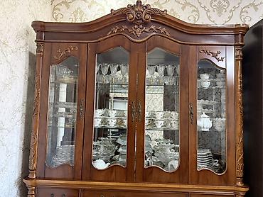 - Конструкция: верхняя часть — 4 стеклянные двери с фигурными рамками, витринные полки из стекла с зеркальной задней стенкой; нижняя часть — 4 глухие дверцы для хранения и 4 выдвижных ящика.