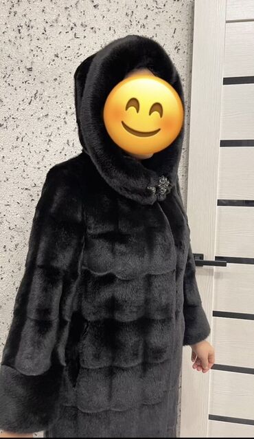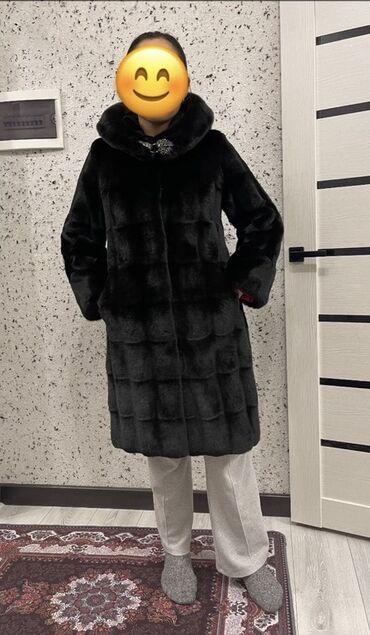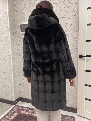 Шуба женская из искуственного меха, цвет глубокий черный. Классический прямой крой до колена, сшивка шкурок «плиткой»/квадратами, создающая объемную фактуру. Объемный капюшон с декоративной брошью-застежкой у горловины. Рукав полный, слегка расширенный к низу. Застежка спереди — потайные крючки. По бокам — удобные прорезные карманы. Подклад темный, внутри рукавов заметна бордовая отделка. Мех густой, с красивым блеском; края капюшона и манжет аккуратно выведены, линии швов ровные. Отличный вариант для холодной погоды и повседневных образов в стиле casual и smart. Размер ориентировочно средний (на фото рост около среднего); посадка свободная. Цвет универсально сочетается с любой обувью и аксессуарами.