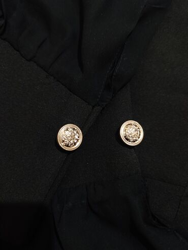 Элегантное черное платье-пиджак мини. - Крой: двубортный силуэт в стиле блейзера с английским воротником и длинными рукавами. - Длина: мини, слегка асимметричный низ. - Детали: объемный бант сбоку...