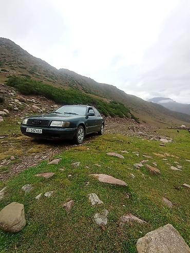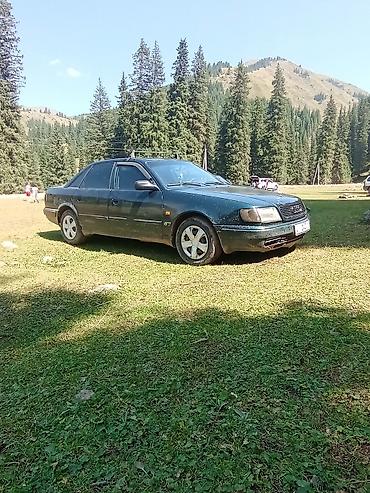 Audi 100 седан, темно-зелёный цвет кузова. Классический кузов C4, 4 двери, тонированные стекла. Передняя оптика прямоугольная, фирменная решетка с четырьмя кольцами. Легкосплавные диски разного дизайна на фото, пять шпилек, низкопрофильные шины. На крыше установлен багажник-релинги под поперечины. Брызговики, молдинги по периметру, боковые поворотники на крыле, зеркала в цвет кузова.