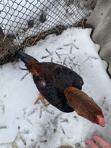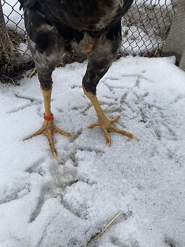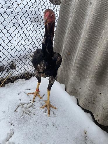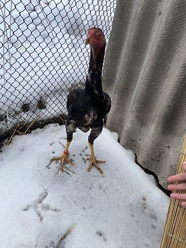 Петух породы бойцового типа (ориентировочно аям‑цемани/азиатская линия). Высокий, на длинных крепких ногах, с узким корпусом и вытянутой шеей. Окрас темный: черное оперение с бронзово‑зеленым отливом, на шее и спине рыжеватые перья. Гребень малозаметный, кожа головы розово‑красная. Клюв светло‑желтый, ноги желтые. На одной лапе установлен красный идентификационный кольцевой маркер.