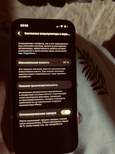- Статус аккумулятора на скриншоте: максимальная ёмкость 91%, включена «Оптимизированная зарядка».