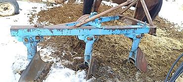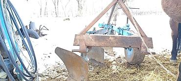- Конструкция: рама с крепкой треугольной навеской под трёхточечное соединение, три рабочих корпуса (лемех + отвал), опорное/регулировочное колесо сбоку.