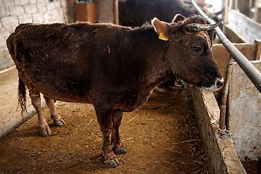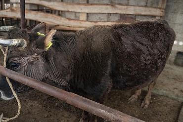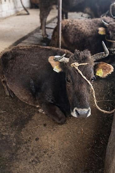 Корова рогатая, темно‑бурой масти, с бирками в ушах (идентификация). Содержится в стойле, привязного содержания. Крупная, с хорошо выраженным костяком и широкой грудью. Рога симметричные, средней длины, копыта ухоженные. Спокойный, уравновешенный тип поведения. Подходит для личного подворья: разведение, молочное направление, возможна откормочная программа.