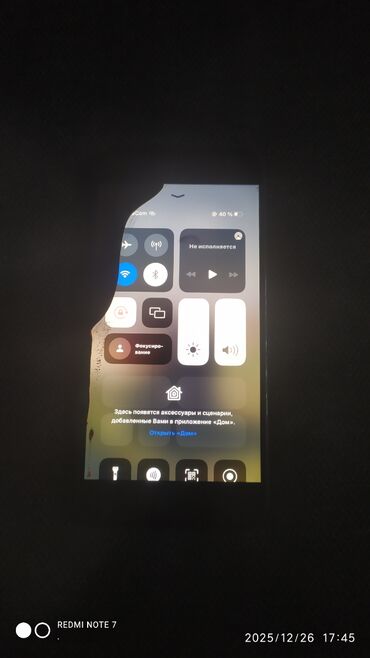 IPhone 7 Plus, цвет Black (матовый). Экран , кнопка Home с Touch ID. Двойная основная камера 12 МП (широкоугольная + телевик) со вспышкой, фронтальная камера. Лоток под одну SIM. iOS установлена; показаны работающий Центр управления, Wi‑Fi, Bluetooth, мобильная сеть и режимы «Фокусирование». Аккумулятор отображается в строке состояния.
