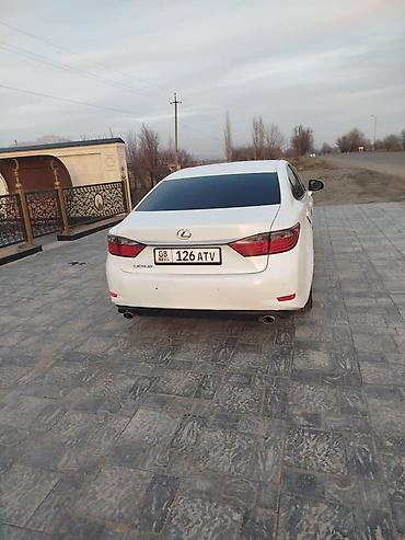 Lexus ES, белый седан бизнес‑класса. Элегантный дизайн с фирменной эмблемой Lexus, светодиодные задние фонари, сдвоенные выхлопные патрубки. Тонированные стекла. Парковочные датчики на заднем бампе...