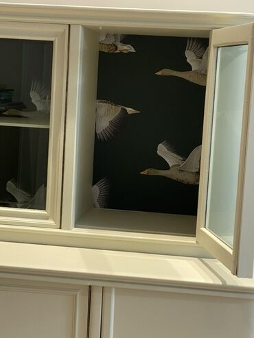 - Внутренний фон витрины Итальянскими обоями, с бутика Сандерс, создает эффектную подложку для сервиза, декора или коллекций.