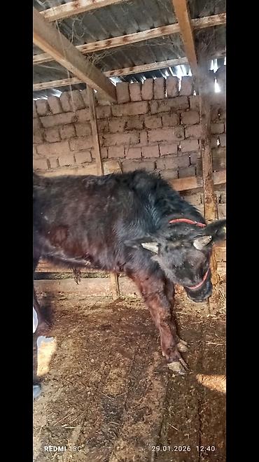 Бык племенной . - Окрас: чёрный, рога средние. - Содержится в стойле, приучен к привязному содержанию. - Кормление: сено, концентраты, вода в свободном доступе (по фото видно кормушку/поилку)....