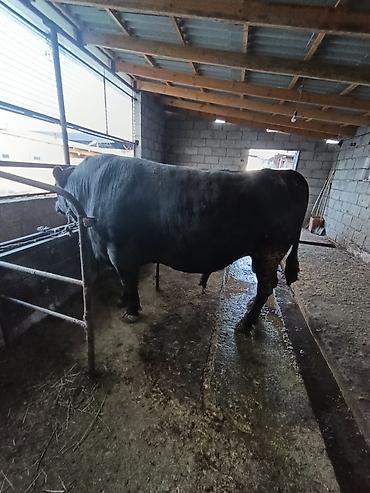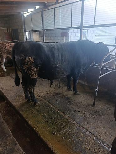 Бык мясного направления, черной масти. Крупный, мускулистый корпус, широкая грудь и развитая задняя часть. Плотная короткая шерсть, ровная линия спины. Уши с желтыми бирками. Содержится в загоне, ж...