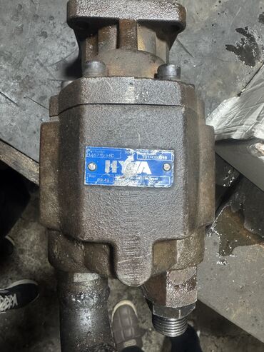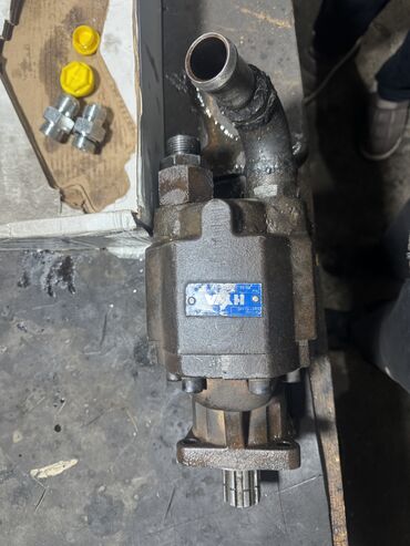 - Порты: напорный/сливной с резьбовыми соединениями, установлен изогнутый сливной штуцер; в комплекте на фото видны два переходника и заглушки