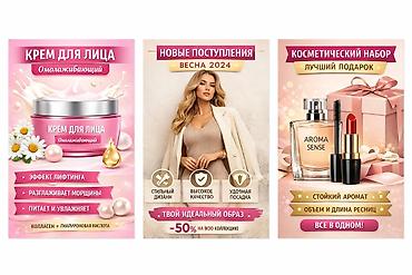 - Косметика и уход: бьюти-баннеры, офферы, преимущества (anti-age, увлажнение и т. п.).