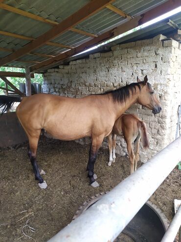 Лошади. На фото — кобыла рыже‑буланой масти с темными ногами и хвостом, а также жеребёнок рядом. Животные содержатся в крытом стойле и на пастбище в саду. У кобылы выраженный корпус, длинная шея, правильная постановка ног и сухая голова спортивного типа. Жеребёнок светлой масти с белой отметиной на ноге.