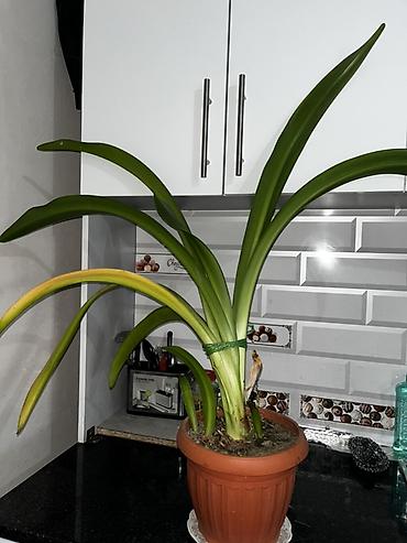 4) Кливия (или крупный амариллисовый) — взрослое розеточное растение в большом горшке. Широкие ремневидные листья, мощная корневая шейка, готово к цветению при правильном периоде покоя. Требует яркого рассеянного света, редкий полив, особенно зимой; не любит заглубления при пересадке.