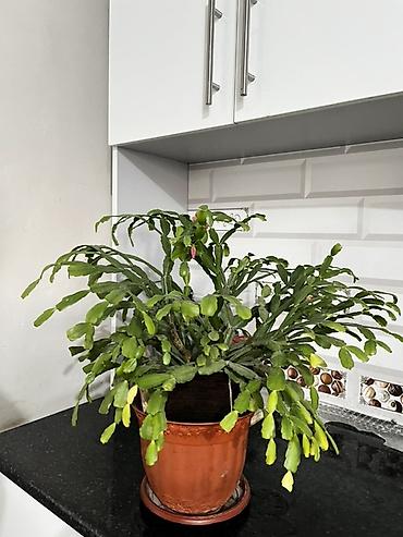 1) Зигокактус (Шлюмбергера, «декабрист») — крупный куст в декоративном пластиковом горшке с поддоном. Мясистые сегментированные побеги, множество закладок бутонов по краям сегментов. Любит рассеянный свет, умеренный полив, без застоя воды. Отлично подходит для подоконников и полок, ежегодно закладывает бутоны при коротком световом дне.