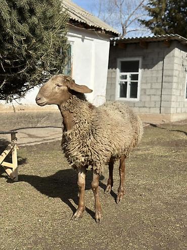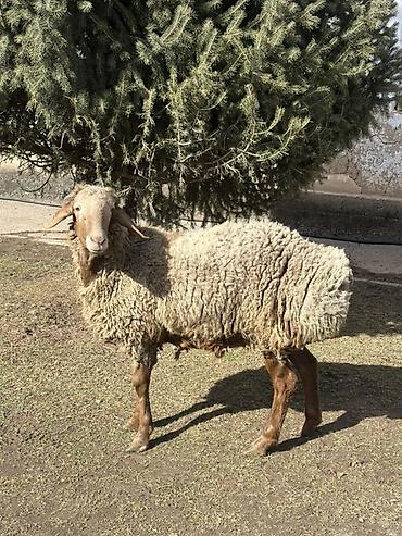 Овца мясо-шерстного направления. - Порода: тонкорунный/полутонкорунный тип (длинное густое руно, выраженный мясной корпус). - Возраст: взрослое животное. - Окрас: светлый, руно кремового оттенка. ...
