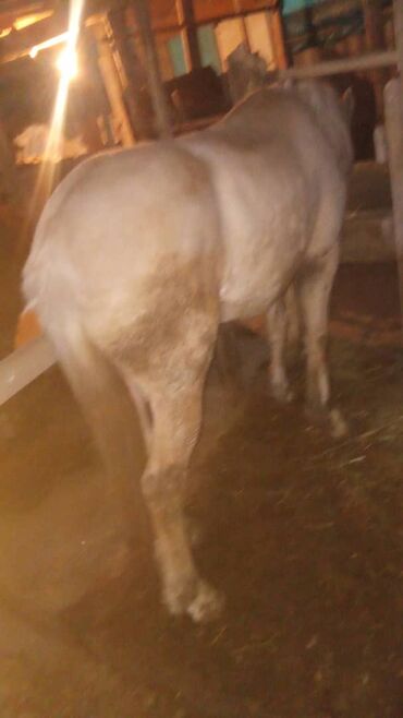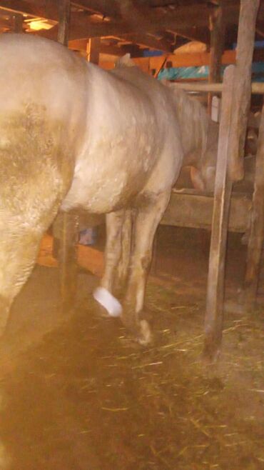 Лошадь светлой масти (приблизительно соловая/паломино) в стойле. На фото — животное в розовой недоуздке, спокойное, с крепким корпусом и развитой мускулатурой крупа. Высокие конечности, ровные копыта, пропорциональная шея и голова. Подойдёт для хозяйственных работ, прогулочного или любительского верхового использования при соответствующей подготовке.