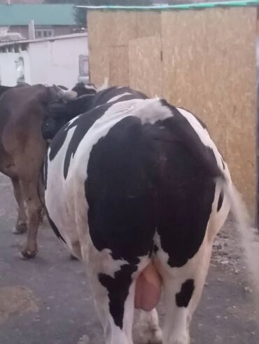 Бык-производитель, чёрно-пёстрый окрас. Крупный, сильный, с широкой грудью и хорошо развитыми мышцами. Содержится в крытом загоне, на привязи, с кормушкой для сена. На фото — реальное животное, спо...