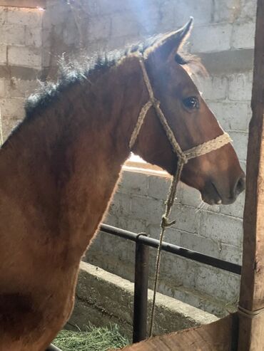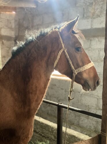 Молодая гнедая лошадь с белой отметиной на лбу и темной гривой/хвостом. На фото — аккуратная голова с правильным профилем, крепкая шея и корпус, ровные ноги. Содержится в стойле, ходит в недоуздке из прочного плетеного шнура (входит в комплект на фото). Подходит для дальнейшего обучения и работы под седлом или в упряжи, перспективна для хозяйственных работ и прогулочного верхового использования. Спокойный, внимательный взгляд, контактная. Отличный вариант для тех, кто ищет молодую лошадь для воспитания под свои задачи.