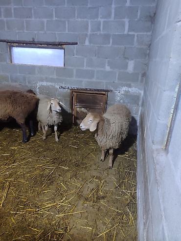 Овцы молодые, ушастого мясо-шерстного типа (вероятно, курдючные/местные помеси). На фото — несколько голов светлой масти с длинными свисающими ушами, плотной полугрубой шерстью кремово-бежевого цвета. Держатся в закрытом овчарне, приучены к стойловому содержанию и выгулу.