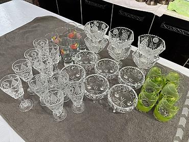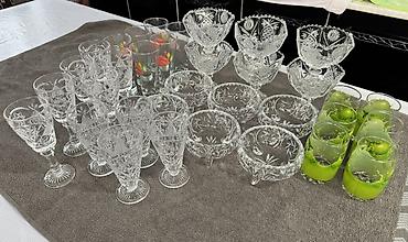 - Бокалы на ножке (гранёные, с резным орнаментом) — около 18–20 шт., объём ориентировочно 100–150 мл. Подойдут для ликёров/крепких напитков/десертов.