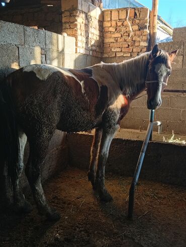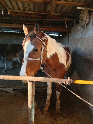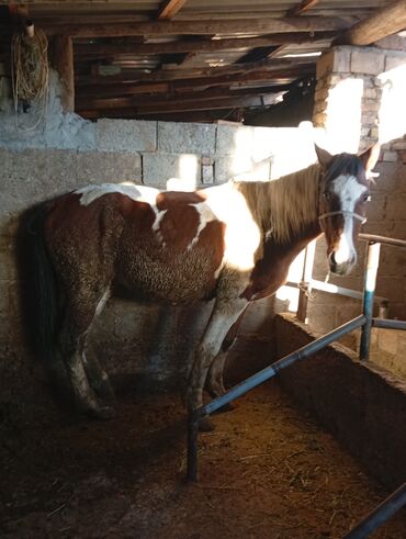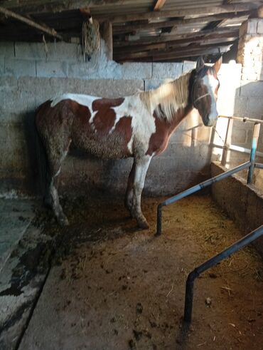 Пегая лошадь (масть: рыже-белая/чубарая), крупного формата.