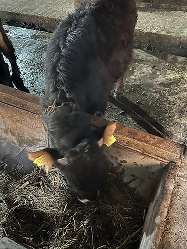 Телята молочно-мясного направления. - Молодые телята (видно на фото: несколько особей, черной и светло-серой масти) - Содержатся в тёплом коровнике, на подстилке из сена/соломы - Активные, на креп...
