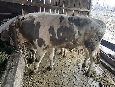 Бык мясного направления. - Окрас: темно‑серый с белой головой. - Рога сформированные, бирки на ушах. - Крупный, широкая грудь и зад, выраженная мускулатура. - Содержится в стойле, приучен к привяз...