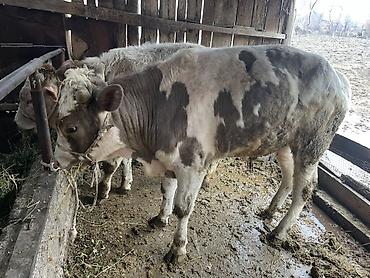 карова мясного направления. - Крупное телосложение, крепкий костяк, развитая мускулатура. - Окрас серо-бурый, рогатый. - Содержится на привязи в крытом стойле, кормление из бетонной кормушки. - По...