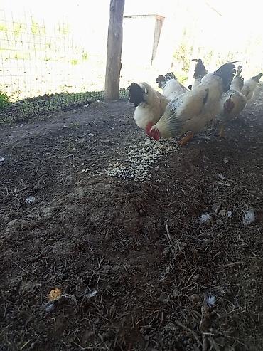 - Петушки и курочки в группе; оперение преимущественно светлое с чёрными хвостовыми перьями и воротником.