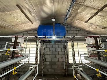 - Освещение по всему птичнику: подвесные светильники равномерно освещают ряды.